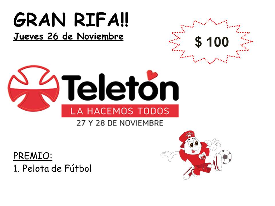 El día Jueves 26 de noviembre, se realizará rifa a favor a la teletón. Su valor es de $100 y el premio es una pelota de fútbol.