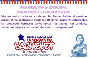 El día viernes 15 de septiembre se celebró las fiestas patrias con la Fondita del Bachelet. Nuestros estudiantes prepararon hermosos bailes típicos, los padres ricas comidas, hubo juegos y mucha entretención.