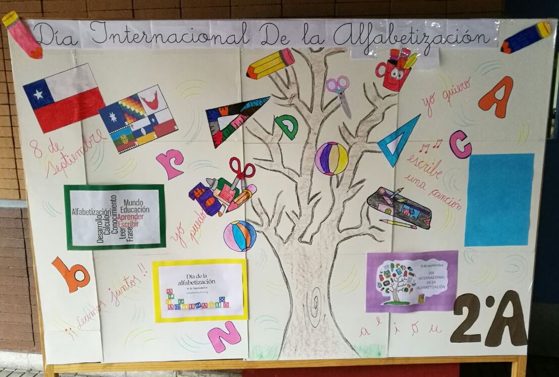 El día lunes 11 de septiembre los estudiantes de 2º A junto a su profesora Fabiola Valdebenito y Magdalena Sánchez, dieron a conocer a los estudiantes de la escuela cuando se promulga el día de la alfabetización y su historia. Además, elaboraron un panel con aspectos gráficos relacionados con el tema de la efeméride.