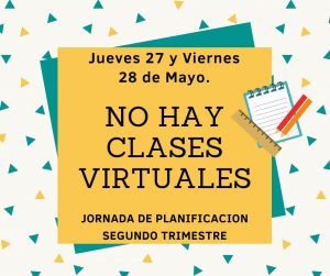 Se informa que el día jueves 27 y viernes 28 de mayo. NO HAY CLASES VIRTUALES. Jornada de planificación Segundo Trimestre.
