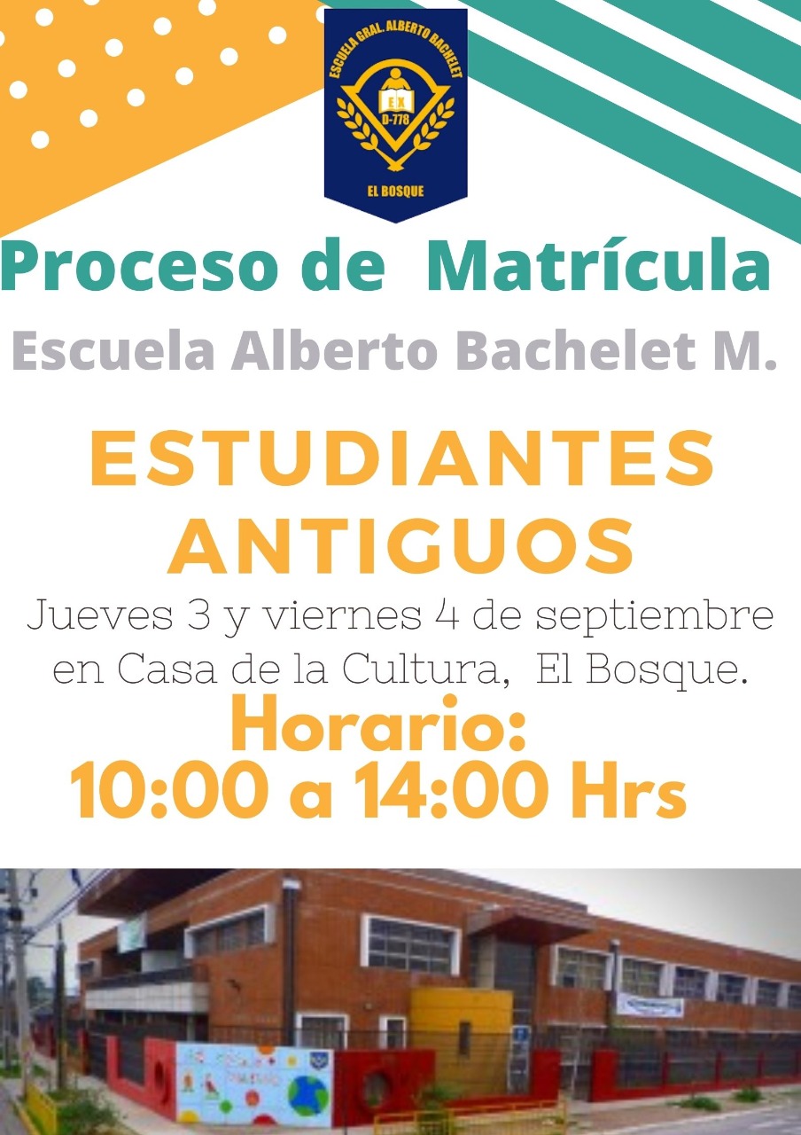 PROCESO MATRÍCULA ESTUDIANTES ANTIGUOS Se informa que el día jueves 3 y viernes 4 de septiembre se estará realizando el proceso de matrícula de estudiantes antiguos en la Casa de la Cultura de la Comuna. Horario: 10:00 a 14:00 Hrs.